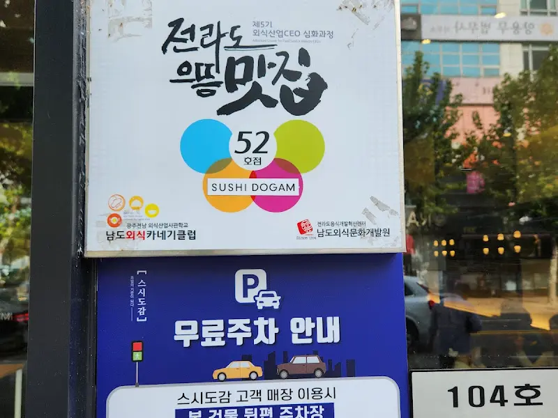 가게 앞에 도착하니, 깔끔한 외관이 눈에 띄었다. “전라도 으뜸 맛집”이라는 문구가 적힌 간판은, 이 곳이 단순한 초밥집이 아닌, 지역을 대표하는 맛집임을 알려주는 듯했다. 커다란 글씨로 적힌 ‘스시도감’이라는 가게 이름과, 그 아래 작게 쓰여진 ‘초밥의 기준이 되다’라는 문구가 인상적이었다. 초밥에 대한 자부심과 철학이 느껴지는 문구였다. 무료 주차 안내판을 보니, 주차 걱정 없이 편안하게 식사를 즐길 수 있겠다는 생각에 마음이 놓였다.
