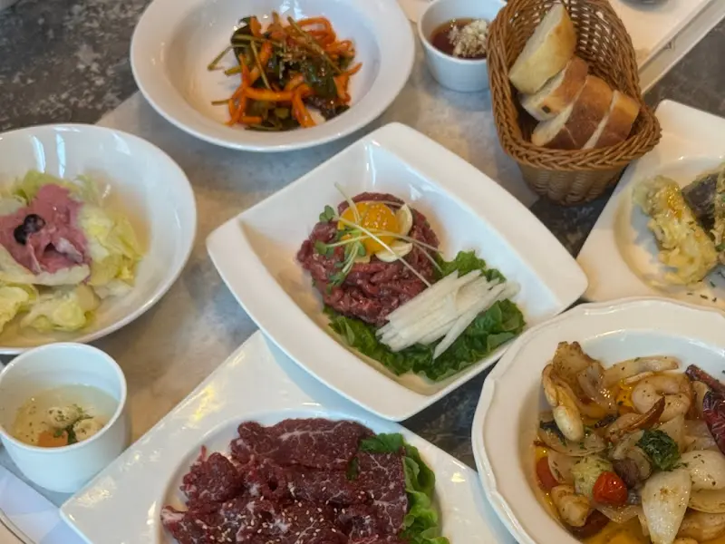 자리에 앉자마자 눈에 띈 것은 2층에 마련된 크리스마스 장식이었다. 마치 동화 속 한 장면처럼 꾸며진 공간은, 연말의 설렘을 미리 느낄 수 있게 해주었다. 크리스마스 트리의 반짝이는 불빛과 아기자기한 소품들은, 식사 전부터 기분 좋은 설렘을 선사했다. 곧이어 정갈하게 차려진 기본 반찬들이 테이블을 가득 채웠다. 신선한 샐러드부터 정갈한 김치, 입맛을 돋우는 나물까지, 하나하나 정성이 느껴지는 맛깔스러운 반찬들은 메인 요리에 대한 기대감을 한껏 끌어올렸다. 특히, 따뜻하게 구워져 나온 바게트 빵은 곁들여 먹기에 훌륭했다.