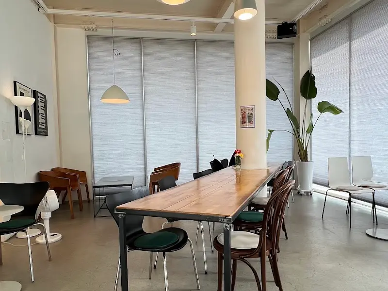 카페 내부는 전체적으로 밝고 따뜻한 분위기를 자아낸다. 흰색 벽면과 높은 천장은 공간을 더욱 넓어 보이게 하고, 곳곳에 배치된 식물들은 싱그러움을 더한다. 테이블과 의자는 나무 소재를 사용하여 편안하고 아늑한 느낌을 주며, 은은한 조명은 따뜻한 분위기를 완성한다. 카운터는 깔끔하게 정리되어 있고, 직원들은 친절하고 활기찬 모습으로 손님을 맞이한다.
