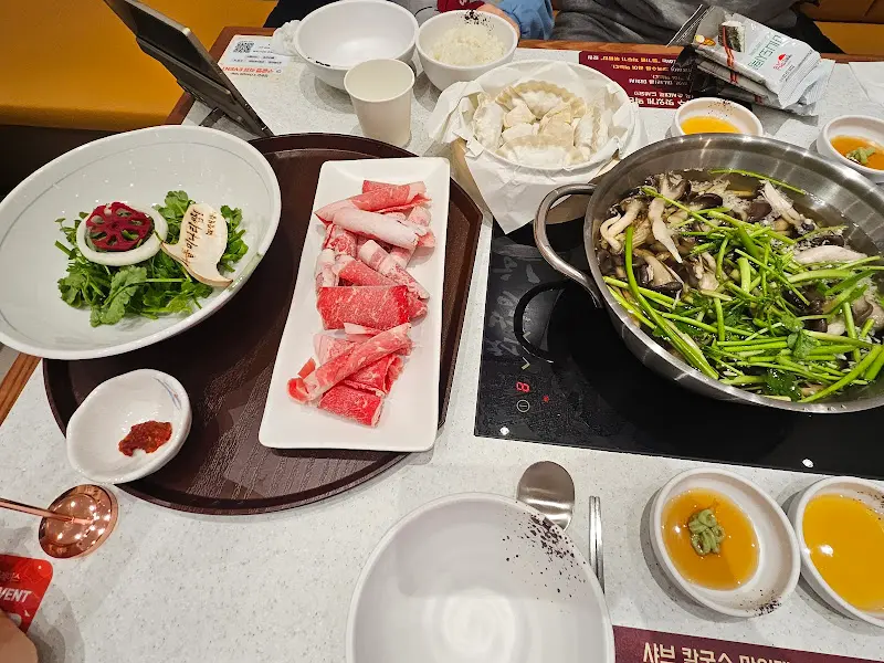 테이블 위에는 샤브샤브를 해먹을 수 있는 냄비와 신선한 채소, 얇게 썰린 소고기가 정갈하게 담겨 나왔다. 샐러드와 김치, 그리고 칼국수 면까지, 보기만 해도 배가 불러오는 듯했다. 특히, 샐러드는 신선한 야채와 상큼한 드레싱이 어우러져 입맛을 돋우기에 충분했다. 붉은 빛깔의 김치는 보기만 해도 군침이 돌았다.