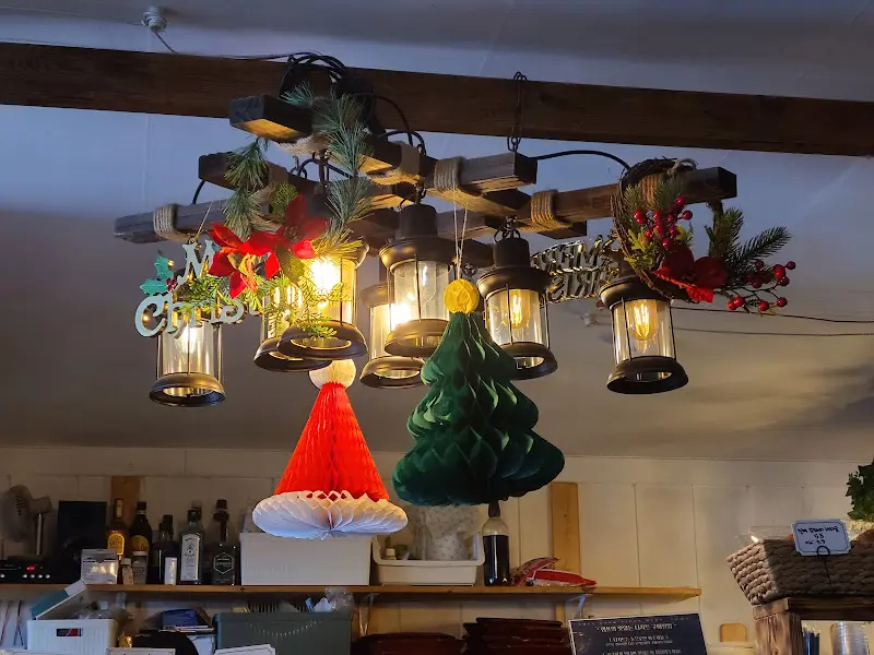 문을 열자 은은하게 퍼지는 커피 향과 아늑한 분위기가 나를 맞이했다. 내부는 생각보다 넓었고, 나무 소재의 가구들과 따뜻한 조명이 편안함을 더했다. 천장에는 독특한 디자인의 조명이 눈길을 사로잡았다. 나무로 짜 맞춘 듯한 틀에 앤티크한 랜턴들이 매달려 있었는데, 크리스마스 장식과 어우러져 더욱 포근한 느낌을 자아냈다. 마치 오래된 다락방에 들어온 듯한 기분이었다.