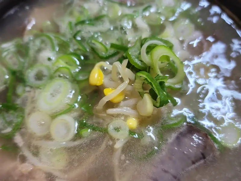드디어 기다리고 기다리던 순대국이 테이블 위에 놓였다. 뚝배기 안에서 보글보글 끓는 모습이 어찌나 먹음직스럽던지. 에서 보듯이, 파와 콩나물이 듬뿍 올라가 있어 더욱 시원해 보이는 국물은, 보기만 해도 속이 확 풀리는 듯했다. 국물 한 숟갈을 떠서 입에 넣으니, 깊고 진한 맛이 온몸을 감싸는 듯했다. 돼지 특유의 잡내는 전혀 느껴지지 않았고, 오히려 깔끔하고 담백한 맛이 일품이었다.