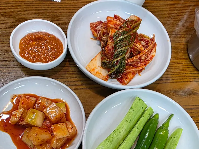 정갈하게 담겨 나온 김치, 깍두기, 오이, 고추