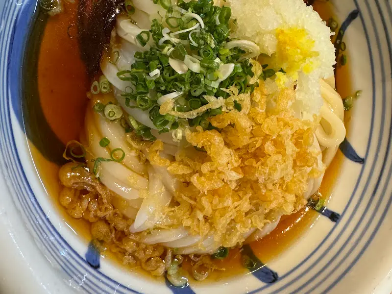 드디어 기다리고 기다리던 가케 우동이 나왔다. 뽀얀 면발 위로 파, 튀김가루, 간 무가 소복하게 올려진 모습은 보는 것만으로도 군침이 돌았다. 투명한 쯔유는 은은한 황금빛을 띠고 있었고, 그 위로 떠오른 기름방울은 깊은 풍미를 예감하게 했다. 사진에서 보이는 것처럼, 면발 위에 올려진 튀김가루는 눅눅하지 않고 바삭했다.