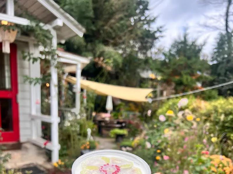 꽃들이 만발한 정원이 손님을 맞이하는 아늑한 카페의 외관