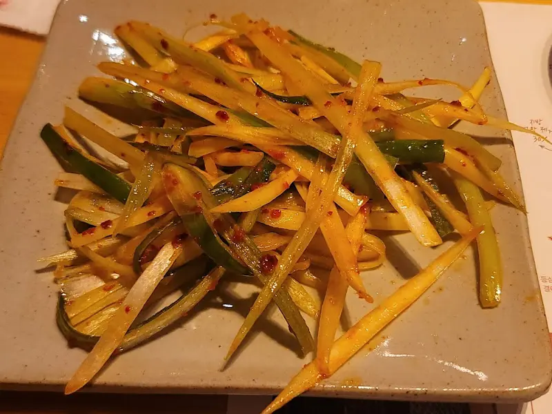 주문 후, 밑반찬들이 하나둘씩 테이블 위를 채워나갔다. 가장 먼저 눈에 띈 것은 파저리였다. 사진에서 보았던 것처럼, 파의 푸른 부분과 흰 부분이 어우러진 모습이 신선해 보였다. 젓가락으로 살짝 집어 맛보니, 파 특유의 알싸한 매운맛이 입안 가득 퍼졌다. 하지만 묘하게 끌리는 맛이었다. 간장 양념장에 찍어 먹으니, 매운맛이 중화되면서 더욱 깊은 풍미를 느낄 수 있었다.