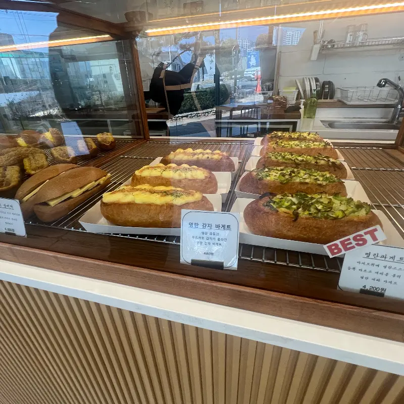 진열대에는 먹음직스러운 빵들이 가득했다. 바삭하게 구워진 바게트, 촉촉한 카스테라, 짭짤한 소금빵까지, 종류도 다양해서 눈이 휘둥그레졌다. 특히 ‘BEST’라고 적힌 명란바게트의 자태는 그냥 지나칠 수 없었다. 빵을 고르는 내내, 어떤 빵을 먹을지 고민하는 행복한 시간이었다.