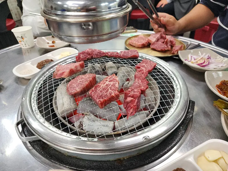 문을 열고 들어서는 순간, 은은하게 풍겨오는 숯불 향이 코를 간지럽혔다. 테이블마다 놓인 숯불 화로 위로 연기가 피어오르는 모습은, 마치 겨울 추위를 녹여주는 따뜻한 온기처럼 느껴졌다. 깔끔하게 정돈된 매장 분위기는 첫인상부터 합격점을 주기에 충분했다. 정육식당답게 쇼케이스 안에는 신선한 한우들이 부위별로 진열되어 있었는데, 그 선명한 마블링에 저절로 침이 꼴깍 넘어갔다.