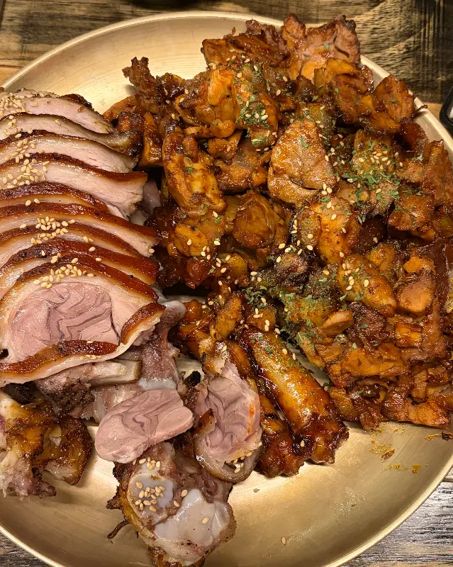 드디어 기다리고 기다리던 반반 족발이 나왔다. 윤기가 좔좔 흐르는 족발과 매콤한 향을 풍기는 매운 족발의 조화는 보기만 해도 황홀했다. 1번 이미지를 보니 다시 그날의 감동이 밀려오는 듯하다. 족발 위에는 깨가 솔솔 뿌려져 있어 먹음직스러움을 더했다. 젓가락을 들어 족발 한 점을 집어 들었다. 쫄깃하면서도 부드러운 식감이 입안 가득 퍼져 나갔다. 돼지 특유의 잡내는 전혀 느껴지지 않았고, 은은한 한방 향이 풍미를 더했다.