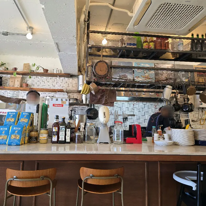 문을 열고 들어서자, 아늑하고 편안한 분위기가 나를 감쌌다. 빈티지한 우드톤의 인테리어는 따뜻하고 정겨운 느낌을 주었고, 은은하게 흘러나오는 음악은 공간의 매력을 한층 더 깊게 만들었다. 오픈 키친에서는 요리사들이 분주하게 움직이는 모습이 보였는데, 그 모습에서 음식에 대한 믿음과 기대감이 더욱 커졌다. 마치 비밀 아지트 같은 공간에서 맛있는 음식을 즐길 생각에 마음이 설렜다. 혼자 방문했음에도 전혀 어색함 없이 바 테이블에 자리를 잡았다. 혼밥족을 위한 배려가 느껴지는 공간 구성이었다.