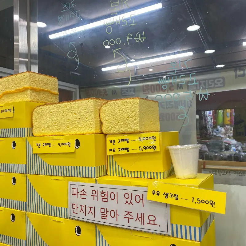 시장 입구에 들어서자, 정겨운 풍경이 눈에 들어왔다. 활기 넘치는 상인들의 목소리와 싱싱한 재료들이 가득한 좌판. 어린 시절 맡았던 익숙한 냄새가 코를 간지럽혔다. 대왕고래카스테라는 시장 안쪽에 자리 잡고 있었다. 노란색 간판에 귀여운 고래 그림이 그려진 아담한 가게는 멀리서도 눈에 띄었다. 마치 어린 시절 동화책에서 튀어나온 듯한 사랑스러운 모습이었다.