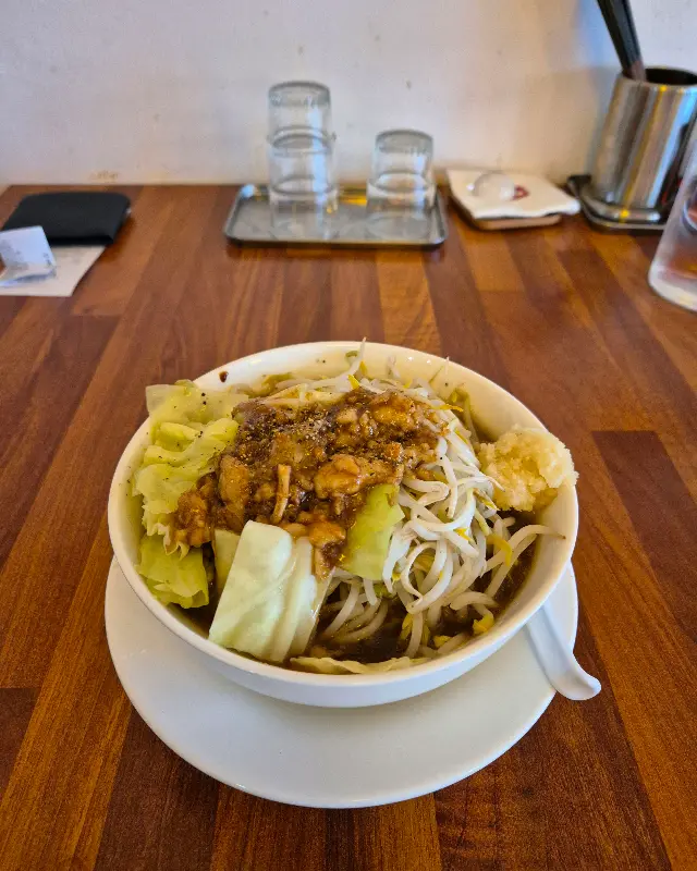 압도적인 비주얼에 입이 떡 벌어졌다. 높게 쌓인 채소, 두툼한 차슈, 그리고 뽀얀 반숙 계란까지. 사진으로만 보던 지로라멘을 실제로 마주하니 감탄사가 절로 나왔다. 얼른 젓가락을 들고 면을 맛봤다. 탱글탱글하면서도 쫄깃한 면발이 입안에서 춤을 추는 듯했다. 마치 칼국수와도 같은 굵은 면이 묵직하게 다가왔다. 국물은 깊고 진한 맛이 일품이었다. 돼지 육수의 풍미가 그대로 느껴지면서도, 과하지 않고 깔끔했다. 쇼유 숙성이 잘 된 멘마는 쿰쿰한 맛없이 깔끔했다. 차슈는 마치 석기시대에 잡은 고기처럼 큼지막했다는 표현이 딱 들어맞았다. 젓가락으로 집어 올리니 묵직한 무게감이 느껴졌다. 족발의 살코기처럼 쫄깃하면서도 부드러운 식감이 인상적이었다.