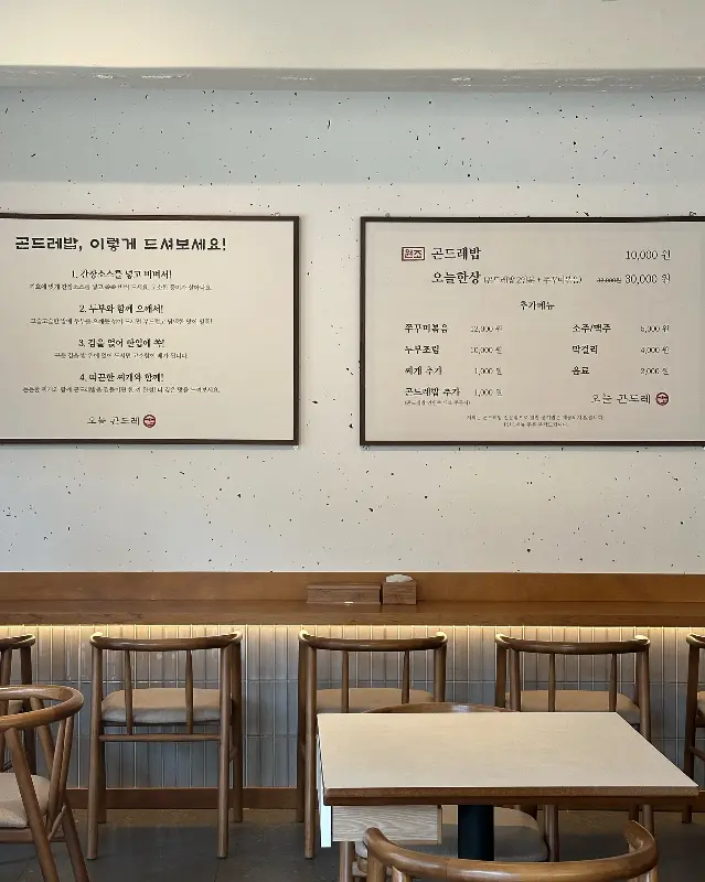 시장 골목을 따라 걷다 보니, 깔끔하고 모던한 외관의 ‘오늘곤드레’가 눈에 들어왔다. 전통적인 시장 분위기 속에서 빛나는 세련된 모습이 인상적이었다. 가게 안으로 들어서자, 은은한 조명이 아늑하게 공간을 감쌌다. 나무 소재의 테이블과 의자는 편안함을 더했고, 벽면에 걸린 메뉴판은 정갈한 느낌을 주었다.