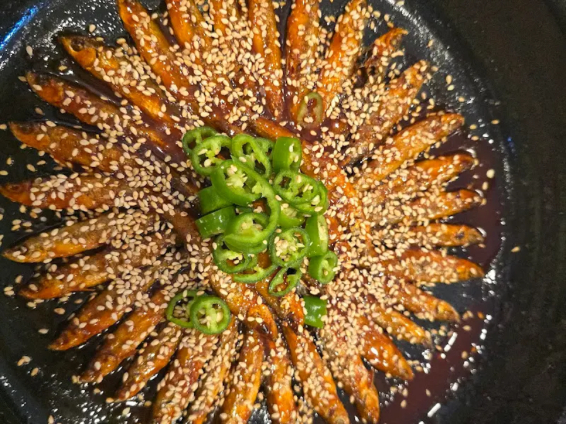 드디어 기다리던 도리뱅뱅이 등장했다. 둥근 철판 위에 뱅어들이 옹기종기 모여 앉아, 고소한 냄새를 풍겼다. 윤기가 자르르 흐르는 뱅어 위에는, 깨가 듬뿍 뿌려져 있었다. 젓가락으로 조심스럽게 하나를 집어 입에 넣으니, 달콤 짭짤한 양념과 바삭한 식감이 환상적인 조화를 이루었다. 멸치강정과는 또 다른, 섬세하면서도 풍부한 맛이었다. 뱅어 특유의 비린 맛은 전혀 느껴지지 않았고, 오히려 고소함이 입안 가득 퍼져 나갔다. 한입 베어 물 때마다 느껴지는 바삭거리는 식감은, 마치 작은 불꽃놀이가 입안에서 펼쳐지는 듯했다. 중앙에 놓인 청양고추 슬라이스는 신의 한 수였다. 느끼할 수 있는 맛을 깔끔하게 잡아주면서, 은은한 매콤함으로 입맛을 돋우었다.