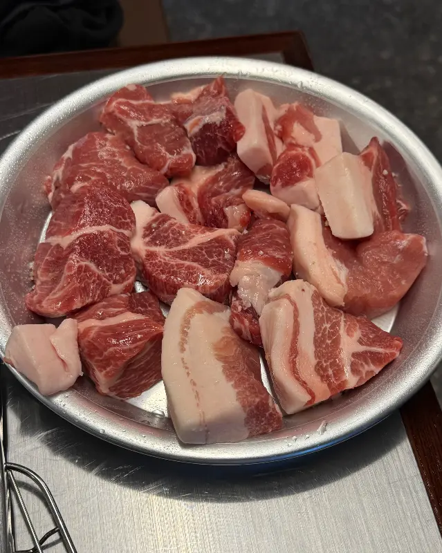 매장 안으로 들어서자, 따뜻하고 푸근한 분위기가 나를 감쌌다. 은은한 조명 아래 나무 테이블과 의자가 정겹게 놓여 있었고, 테이블마다 환풍시설이 잘 갖춰져 있어 쾌적한 식사를 기대하게 했다. 직원분들의 친절한 안내를 받으며 자리에 앉으니, 마치 오랜 단골집에 온 듯 편안한 느낌이 들었다. 벽면에는 뭉텅의 메뉴와 함께 고기에 대한 설명이 적혀 있었는데, 꼼꼼하게 신경 쓴 흔적이 엿보였다.