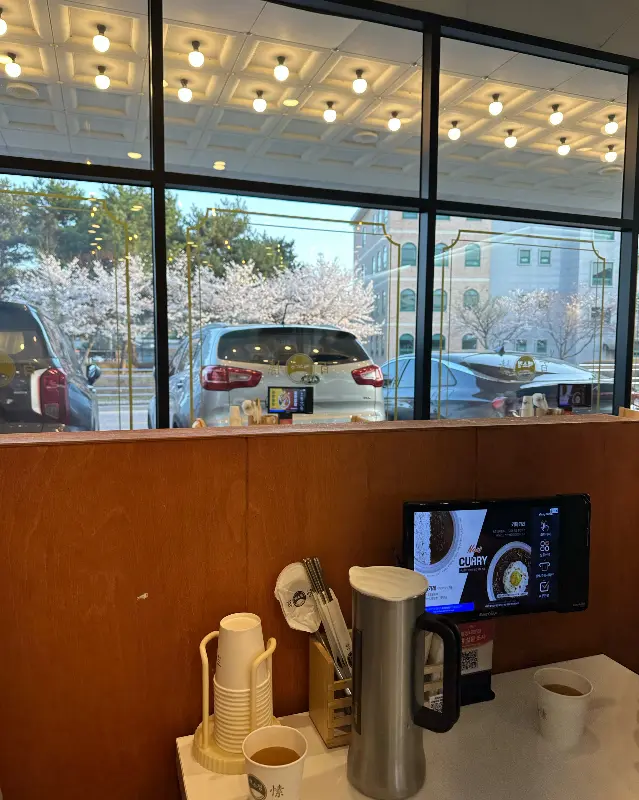 주문을 마치고 주변을 둘러보니, 매장 곳곳에 세심한 인테리어 소품들이 눈에 띄었다. 일본풍의 아기자기한 그림들과 깔끔하게 정돈된 테이블, 그리고 은은하게 흘러나오는 잔잔한 음악까지, 모든 요소들이 조화롭게 어우러져 편안한 분위기를 연출하고 있었다. 특히 테이블마다 놓인 작은 화분은 싱그러움을 더하며 식사를 기다리는 시간을 더욱 즐겁게 만들어 주었다. 큰 창밖으로는 벚꽃이 만개해 그림같은 풍경이 펼쳐졌다.
