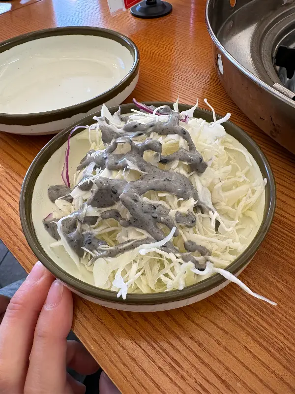 고민 끝에, 가장 기본인 ‘장인닭갈비’에 모짜렐라 치즈 사리를 추가하고, 볶음밥까지 먹기로 결정했다. 주문을 마치자, 직원분이 능숙한 솜씨로 테이블을 세팅해주셨다. 스테인리스 물통에서 시원한 물을 컵에 따르고, 숨을 고르며 주변을 둘러봤다. 테이블마다 놓인 큼지막한 철판이 닭갈비에 대한 기대감을 한껏 끌어올렸다. 곧이어, 흑임자 드레싱이 곁들여진 양배추 샐러드와 시원한 동치미가 나왔다. 흑임자 드레싱의 고소한 향이 식욕을 자극했다. 샐러드를 한 입 맛보니, 신선한 양배추의 아삭한 식감과 흑임자의 깊은 풍미가 조화롭게 어우러졌다.