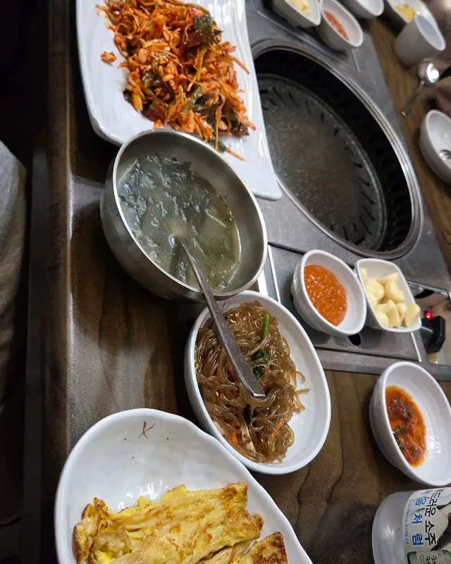 메뉴판을 펼쳐보니, 다양한 부위의 한우와 돼지고기가 준비되어 있었다. 고민 끝에, “무항생제 투뿔 돼지고기” 라는 문구에 이끌려 삼겹살과 목살을 주문했다. 잠시 후, 정갈하게 차려진 밑반찬들이 테이블을 가득 채웠다. 샐러드부터 시작해서, 잡채, 묵, 김치, 그리고 따뜻한 미역국까지. 하나하나 정성이 느껴지는 맛깔스러운 반찬들이었다. 특히, 야채무침은 신선한 채소와 매콤달콤한 양념이 어우러져 입맛을 돋우는 데 제격이었다.