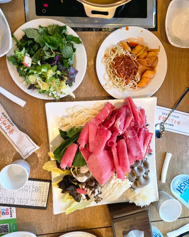 샐러드바에서 이것저것 가져다 먹는 사이, 드디어 메인 메뉴인 샤브샤브가 나왔다. 눈으로 보기에도 신선함이 느껴지는 각종 버섯과 채소, 그리고 붉은 빛깔의 소고기가 푸짐하게 담겨 나왔다. 버섯 종류가 정말 다양했는데, 팽이버섯, 느타리버섯, 새송이버섯은 물론이고 이름도 생소한 다양한 버섯들이 한가득 담겨 있었다.