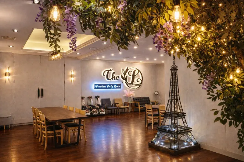 특히 내 눈길을 사로잡은 것은, 파티하우스더엘 곳곳에 마련된 아름다운 포토존들이었다. 화사한 꽃 장식과 은은한 조명이 어우러진 공간은, 마치 동화 속 한 장면을 연상시켰다. 홀 내부에는 에펠탑 모형과 샹들리에, 그리고 화려한 조명이 어우러져 고급스러움을 더했고, 야외 테라스에는 “I LOVE YOU” 문구가 적힌 깃발이 걸린 나무 아래, 아기자기한 꽃들이 만발해 사랑스러운 분위기를 자아냈다. 사진 찍는 것을 좋아하는 나에게는, 이 모든 공간들이 그저 황홀하게 느껴졌다.