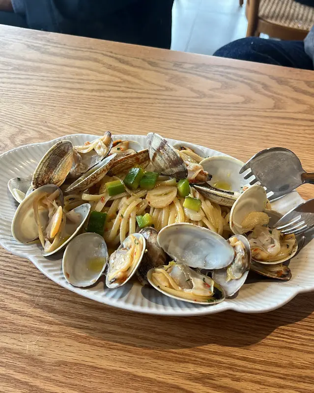 드디어 기다리고 기다리던 메뉴들이 하나씩 나오기 시작했다. 가장 먼저 눈에 들어온 것은 봉골레 파스타였다. 신선한 바지락이 듬뿍 들어가 있었고, 파스타 면도 탱글탱글 살아 있었다. 포크로 면을 돌돌 말아 한 입 맛보니, 입안 가득 퍼지는 바다 향이 일품이었다. 바지락의 짭짤한 맛과 은은한 마늘 향이 어우러져 정말 맛있었다. 특히 바지락 해감이 완벽해서 모래 하나 씹히지 않았다는 점이 마음에 쏙 들었다.