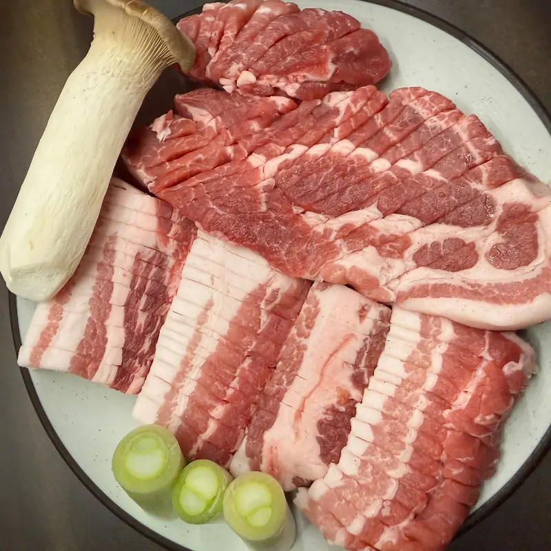 자리를 잡고 앉아 메뉴판을 펼쳤다. 삼겹살, 목살, 꽃목살 등 다양한 부위의 돼지고기가 눈에 들어왔다. 고민 끝에 나는 삼겹살과 목살을 함께 주문하기로 했다. 고기 질이 좋다는 평이 많았으니, 당연히 맛봐야 할 메뉴였다. 잠시 후, 숯불이 들어오고, 곧이어 기다리던 고기가 등장했다.