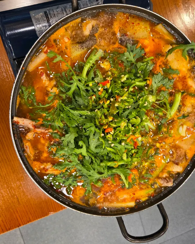 밑반찬을 맛보며 이야기를 나누는 사이, 드디어 기다리고 기다리던 오리탕이 등장했다. 뽀얀 국물 위로 듬뿍 올려진 싱싱한 미나리가 시선을 사로잡았다. 마치 그림 같은 비주얼에, 나도 모르게 침이 꼴깍 넘어갔다.