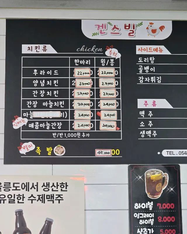 겐스빌 치킨은 아늑하고 정겨운 분위기의 동네 치킨집이었다. 노란색 외벽에 큼지막하게 그려진 닭 그림이 인상적이었고, 가게 앞을 지날 때마다 풍겨오는 고소한 치킨 냄새가 발길을 멈추게 했다. 문을 열고 들어서니, 깔끔하게 정돈된 실내가 눈에 들어왔다. 테이블 몇 개가 놓인 아담한 공간이었지만, 편안하게 치맥을 즐기기에 부족함이 없었다. 벽 한쪽에는 메뉴판이 붙어 있었는데, 후라이드, 양념, 간장 등 다양한 치킨 메뉴와 족발이 눈길을 끌었다.