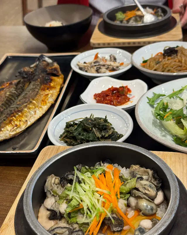 자리를 잡고 앉아 메뉴판을 펼쳐 들었다. 돌솥밥 종류가 다양해서 한참을 고민했다. 해물돌솥밥, 영양돌솥밥, 전복돌솥밥… 다 맛있어 보여서 결정 장애가 올 뻔했다. 결국, 2인 정식에 밥은 해물돌솥밥으로 변경하기로 했다. 정식에는 불고기와 생선구이도 함께 나온다고 하니, 여러 가지를 맛볼 수 있어서 좋을 것 같았다. 잠시 후, 정갈하게 차려진 한 상이 눈앞에 펼쳐졌다.