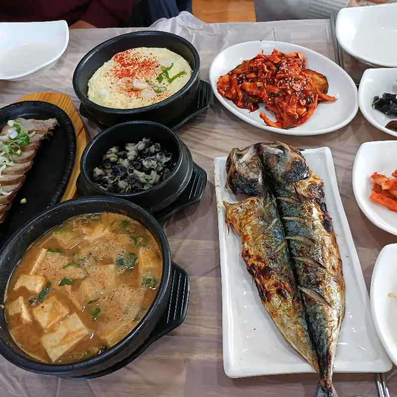 주문을 마치자마자 놀라울 정도로 빠르게 상이 차려졌다. 마치 마법이라도 부린 듯 순식간에 테이블 가득 음식이 놓였다. 쌈 채소의 싱그러운 초록빛, 갓 구워져 김이 모락모락 나는 고등어구이, 그리고 뚝배기에 담긴 된장찌개의 구수한 향까지, 오감을 자극하는 향연에 정신을 놓을 뻔했다.