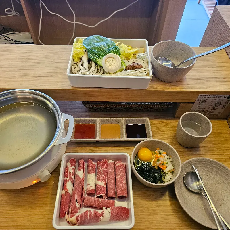 가게 문을 열고 들어서자, 따뜻하고 편안한 분위기가 저를 맞이했습니다. 우드톤의 인테리어와 은은한 조명이 어우러져 아늑한 느낌을 주었고, 잔잔하게 흐르는 음악은 혼자만의 식사를 더욱 풍요롭게 만들어줄 것 같았습니다. 테이블마다 놓인 개인용 인덕션은 깔끔함을 더했고, 혼자서도 부담 없이 샤브샤브를 즐길 수 있도록 세심하게 배려한 모습이 인상적이었습니다. 혼밥을 즐기는 저에게는 더할 나위 없이 완벽한 공간이었습니다.