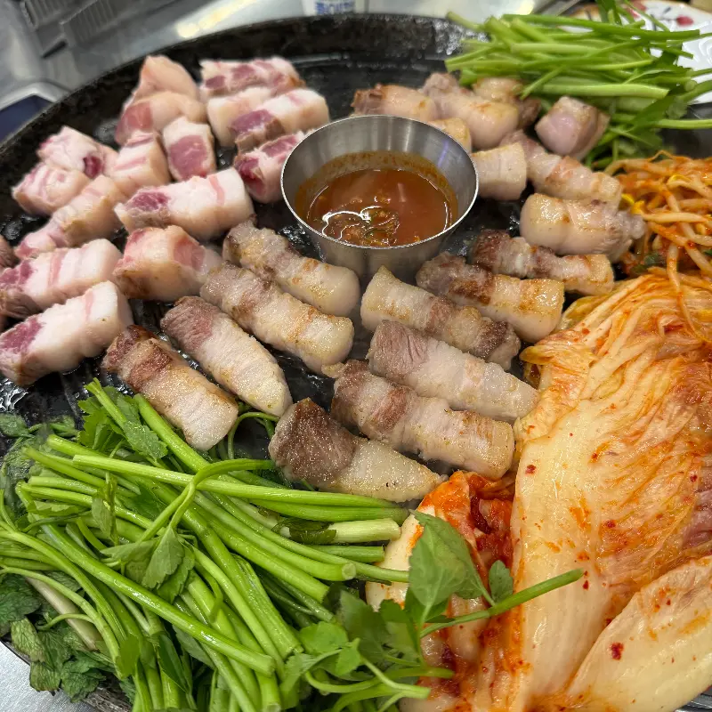 직원분들은 능숙한 솜씨로 고기를 구워주셨다. 덕분에 편안하게 맛있는 고기를 즐길 수 있었다. 노릇노릇하게 익어가는 삼겹살을 보니, 저절로 미소가 지어졌다. 잘 익은 고기 한 점을 소금에 살짝 찍어 입에 넣으니, 씹자마자 육즙이 팡 터져 나왔다. 쫄깃하면서도 부드러운 식감이 정말 환상적이었다.