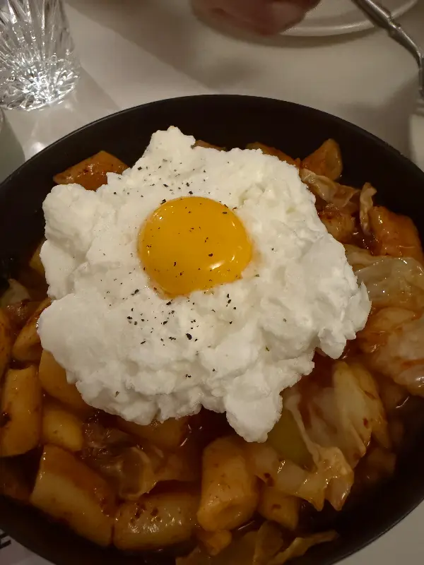드디어 기다리고 기다리던 ‘구름 떡볶이’가 먼저 나왔다. 짙은 고추장 색깔의 떡볶이 위에 마치 구름처럼 하얀 머랭이 덮여 있는 모습은 정말 독특했다. 샛노란 계란 노른자가 머랭 위에 살포시 자리 잡고 있는 모습 또한 시선을 사로잡았다. 떡볶이의 매콤한 향과 머랭의 달콤한 향이 묘하게 어우러져 식욕을 자극했다.
