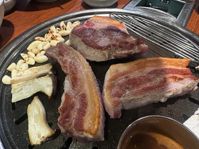 상추에 쌈무, 파채, 마늘, 그리고 잘 익은 고기를 올려 크게 한 쌈 싸서 먹으니, 그야말로 꿀맛이었다. 쌈 채소의 신선함과 고기의 풍미가 어우러져 환상의 조합을 자랑했다. 아이들은 1층 키즈존에서 신나게 뛰어놀다가도, 고기 냄새를 맡고 2층으로 올라와 밥 한 공기를 뚝딱 비우고 다시 내려가곤 했다. 아이들이 맛있게 먹는 모습을 보니, 괜히 마음이 흐뭇해졌다.