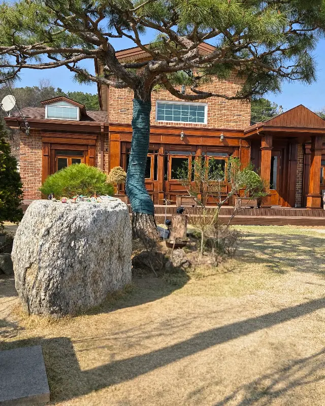 굽이굽이 이어진 좁은 시골길을 따라 한참을 들어가니, 마치 비밀 정원처럼 숨겨진 가채리504가 모습을 드러냈다. 붉은 벽돌로 지어진 외관은 따뜻하고 정겨운 느낌을 자아냈다. 마치 할머니 댁에 놀러 온 듯한 푸근함이랄까. 입구에 들어서자 잘 가꿔진 잔디 마당이 눈 앞에 펼쳐졌다. 아이들이 뛰어놀기 좋게 널찍하게 펼쳐진 초록빛 잔디밭은 보기만 해도 마음이 평온해지는 듯했다.