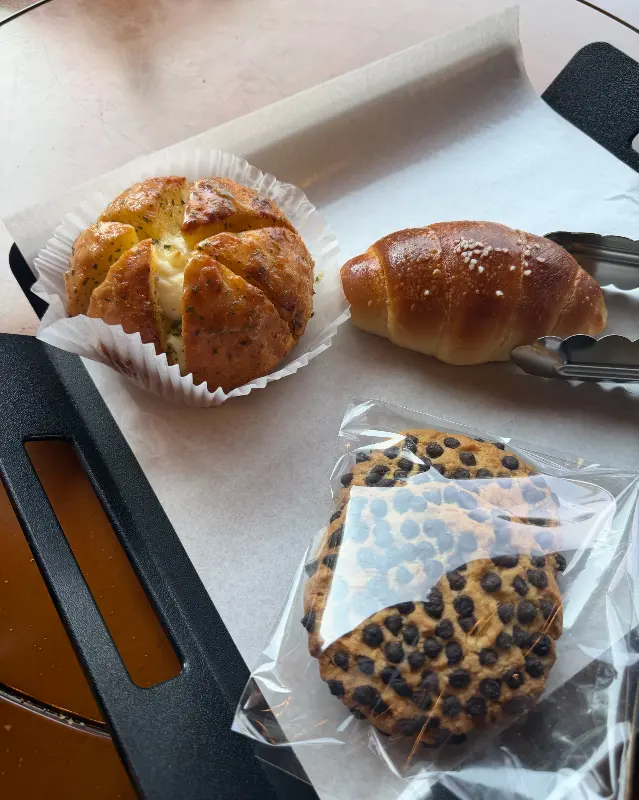 쟁반과 집게를 들고 빵 구경에 나섰다. 윤기가 자르르 흐르는 몽블랑, 짭짤한 버터 향이 매력적인 소금빵, 달콤한 크림이 가득한 크림빵, 겉은 바삭하고 속은 촉촉한 치즈 바게트까지. 하나하나 눈으로 훑어보는 것만으로도 행복감이 밀려왔다. 특히 남편이 극찬했던 마늘빵은 꼭 맛봐야겠다는 생각에 잊지 않고 쟁반에 담았다. 큼지막한 빵들은 보기만 해도 배가 불렀고, 나눠 먹기에도 좋을 것 같았다.