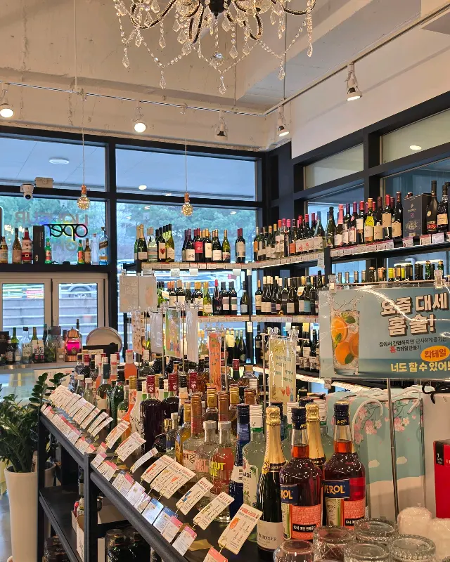 노브랜드 건물이 눈에 들어왔다. 1층에 자리 잡은 ‘고래맥주창고’는 생각보다 훨씬 아늑하고 따뜻한 분위기였다. 무심하게 지나칠 뻔한 공간이었지만, 안으로 들어서는 순간, 전혀 다른 세계가 펼쳐졌다. 은은한 조명 아래, 마치 동굴처럼 펼쳐진 공간에는 술들이 가득했다. 와인, 맥주, 위스키, 사케, 심지어 중국 술까지… 그야말로 없는 게 없는 술의 천국이었다.