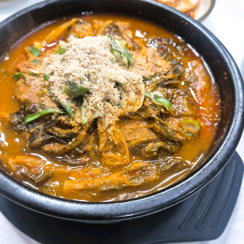 감자탕 냄비 안에는 큼지막한 돼지 등뼈와 묵은지, 깻잎, 팽이버섯 등 다양한 재료들이 아낌없이 들어가 있었다. 특히, 산처럼 쌓인 깻잎 위에 듬뿍 뿌려진 들깨 가루는 보기만 해도 고소한 향이 느껴지는 듯했다. 국물은 짙은 갈색을 띠고 있었는데, 보기만 해도 깊고 진한 맛이 느껴졌다.