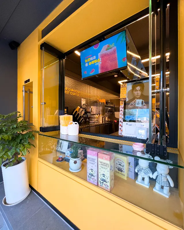 매장은 생각보다 아늑하고 깔끔했다. 노란색을 포인트 컬러로 사용하여 따뜻하고 활기찬 느낌을 주었고, 은은한 조명은 편안한 분위기를 더했다. 밖에서 보기보다 훨씬 넓었고, 테이블 간 간격도 넉넉해서 혼자 조용히 시간을 보내기에도 좋아 보였다. 한쪽 벽면에는 컴포즈 커피의 모델 사진이 걸려있었는데, 왠지 모르게 친근한 느낌이 들었다.