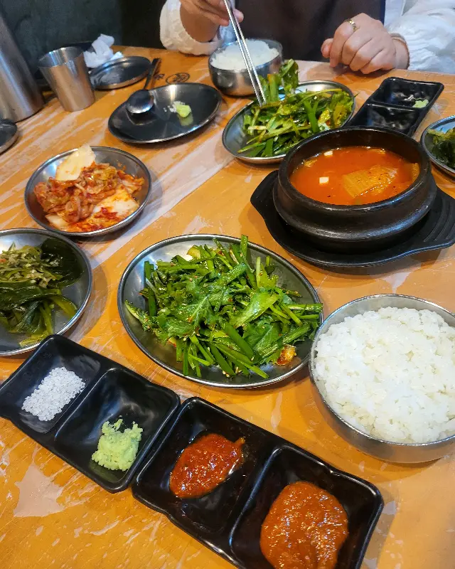 주문을 마치자, 순식간에 밑반찬들이 테이블을 가득 채웠다. 싱싱한 쌈 채소, 잘 익은 묵은지, 명이나물, 그리고 하남돼지집의 자랑인 김치찌개까지. 특히 김치찌개는 서비스로 제공되는 것임에도 불구하고, 돼지고기가 듬뿍 들어가 있어 국물이 진하고 칼칼했다. 밥 한 공기를 순식간에 비울 수 있을 것 같은 맛이었다.