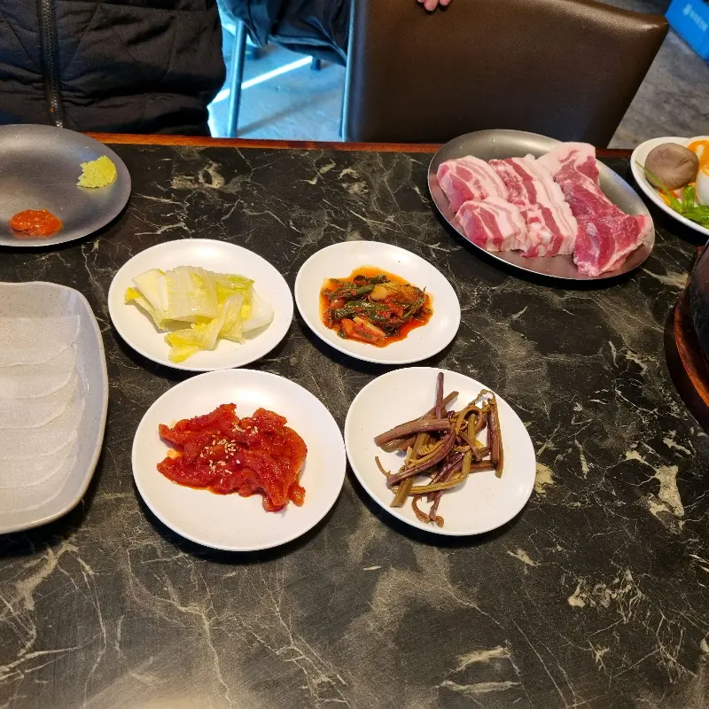 자리에 앉자마자 메뉴판을 펼쳐 들었다. 흑돼지 목살과 삼겹살, 그리고 김치찌개와 된장찌개 등 익숙하면서도 맛깔스러운 메뉴들이 눈에 들어왔다. 고민 끝에 흑돼지 목살 2인분과 된장찌개, 그리고 시원한 동치미 국수를 주문했다. 잠시 후, 정갈하게 차려진 밑반찬들이 테이블을 가득 채웠다. 윤기가 자르르 흐르는 파김치, 향긋한 미나리 무침, 짭짤한 고사리 장아찌 등 하나하나 정성이 느껴지는 맛이었다. 특히, 파김치는 흑돼지와 환상적인 궁합을 자랑했다.