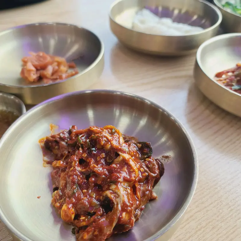 어머니께서 그토록 칭찬하시던 어리굴젓도 맛보았다. 붉은 양념에 버무려진 어리굴젓은 보기만 해도 입안에 침이 고였다. 젓갈 특유의 쿰쿰한 냄새는 전혀 나지 않았고, 신선하고 매콤한 향이 코를 자극했다. 밥 위에 어리굴젓을 올려 한 입 먹으니, 톡 쏘는 듯한 매콤함과 굴 특유의 바다 향이 환상적으로 어우러졌다. 짭짤하면서도 감칠맛 도는 어리굴젓은 정말 밥도둑이 따로 없었다.