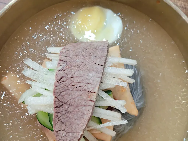 젓가락으로 면을 들어 올리니, 탄력 있는 면발이 묵직하게 느껴졌습니다. 한 입 맛보니, 기대 이상의 맛에 감탄했습니다. 육수는 깔끔하면서도 깊은 맛이 느껴졌고, 면발은 쫄깃함을 넘어 탱탱한 식감을 자랑했습니다. 흔히 냉면에 식초나 겨자를 넣어 먹지만, 이곳의 냉면은 그럴 필요가 없었습니다. 육수 자체가 완벽하게 균형 잡힌 맛을 내고 있었기 때문입니다.