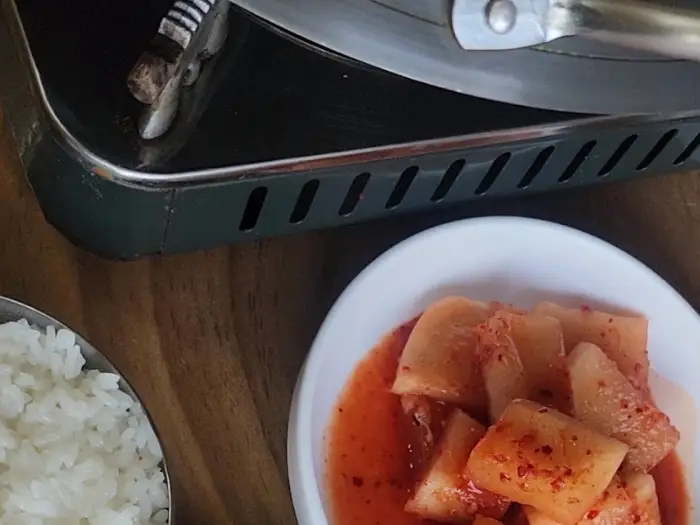 특히 좋았던 건, 함께 나온 반찬들이었어요. 겉절이 김치, 멸치볶음, 콩나물무침, 그리고 깍두기까지! 마치 집에서 먹는 듯한 정갈하고 맛깔스러운 반찬들이었죠. 하나하나 다 제 입맛에 딱이었는데, 특히 깍두기는 새콤달콤하면서도 아삭한 식감이 일품이었습니다. 밥 한 공기를 뚝딱 비우게 만드는 마성의 맛이었어요.