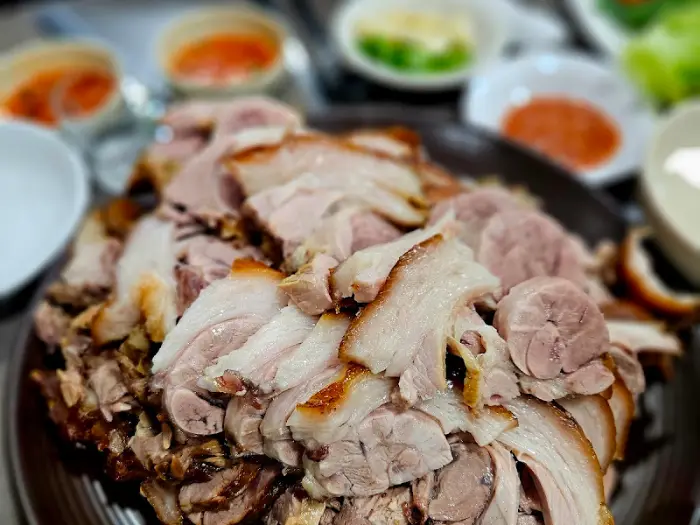 이곳의 보쌈은 넉넉한 양의 돼지고기 수육과 함께, 붉은 양념이 수북하게 덮인 보쌈김치로 구성되어 나옵니다. 수육은 따로 특별할 것 없다는 평도 있지만, 제 경험상으로는 담백하면서도 부드러운 식감이 훌륭했습니다. 기름진 부위와 살코기 부위가 적절히 섞여 있어, 느끼함과 담백함 사이의 균형을 잘 잡아주었습니다. 기름진 부위를 먼저 먹다가 느끼해질 때쯤 담백한 살코기를 먹으면, 마치 처음 먹는 것처럼 새로운 맛을 느낄 수 있었습니다.
