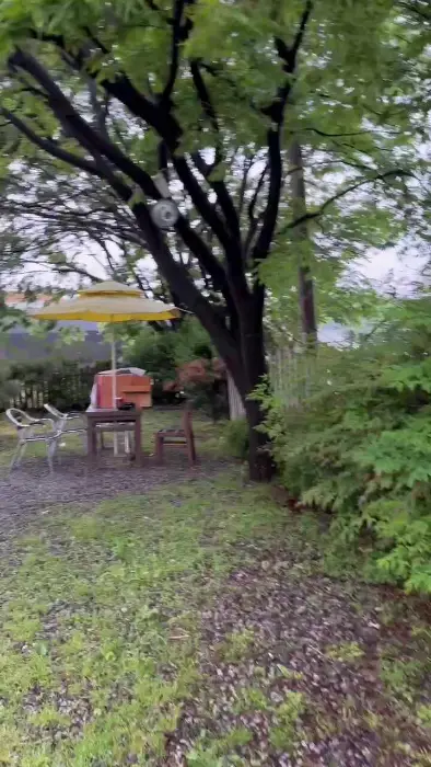 식당 외부 풍경, 나무와 테이블, 우산이 보이는 풍경