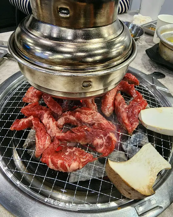 메뉴판에는 다양한 종류의 소고기 메뉴가 눈에 띄었지만, 저희는 단연 ‘소갈비살’에 시선이 꽂혔습니다. 사진 속에서부터 신선함이 물씬 풍기는 붉은빛의 육질은 단연 압도적이었습니다. 주문을 마치자마자, 직원분들의 분주하면서도 친절한 움직임이 시작되었습니다. 숯불이 테이블 중앙에 놓인 원형 불판 위로 자리 잡았고, 이내 곧이어 고기 접시가 등장했습니다. 접시 위에는 마치 예술 작품처럼 정성스럽게 담긴 소갈비살이 보석처럼 빛나고 있었습니다. 선명한 붉은빛 사이사이에 촘촘히 박힌 하얀 지방은 이 고기가 얼마나 부드럽고 육즙 가득할지 짐작케 해주었죠. 곁들임으로 나온 큼직한 새송이버섯 또한 고기의 풍미를 더해줄 기대감을 안겨주었습니다.