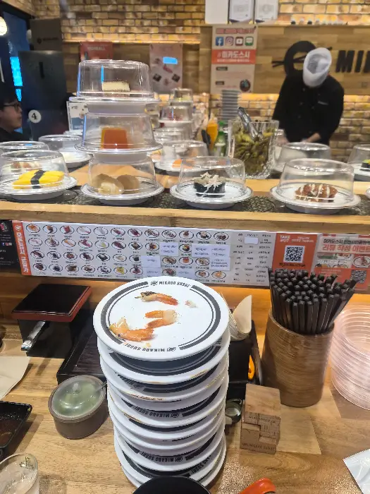문을 열고 들어서자, 고소한 쌀 내음과 짭조름한 해산물의 향이 뒤섞여 코끝을 간질였다. 눈앞에는 다채로운 빛깔의 초밥들이 행렬을 지어 천천히 레일을 따라 흐르고 있었다. 갓 만든 듯 윤기 나는 생선살, 아삭한 채소, 그리고 부드러운 밥알의 조화가 보는 이의 침샘을 자극하기에 충분했다. 하나하나 정성껏 만들어진 초밥들을 바라보는 것만으로도 이미 마음은 즐거움으로 가득 찼다.