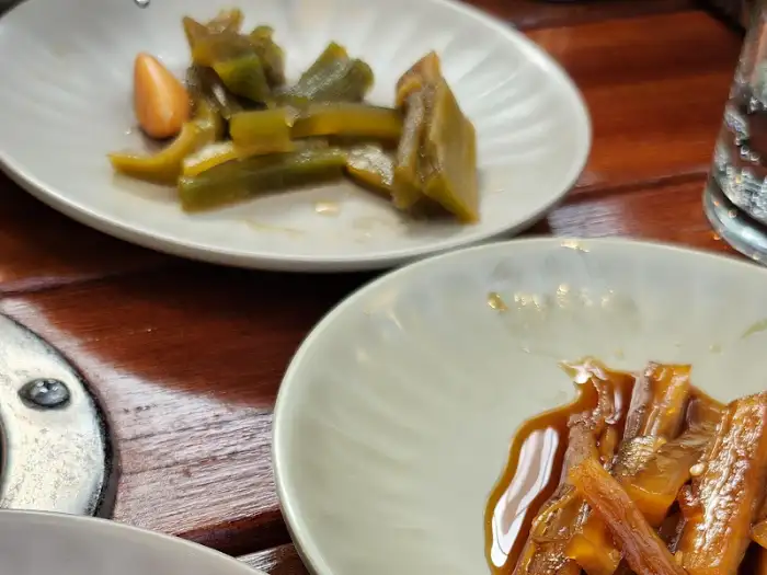 자리에 앉자마자 눈앞에 펼쳐진 상차림은 군더더기 없이 깔끔했습니다. 젓가락을 집어 들기 무섭게, 각종 신선한 나물과 다채로운 곁들임 음식들이 테이블 위를 채웠습니다. 무엇보다 눈에 띄었던 것은 식기들이었습니다. 겉보기에도 깨끗함이 느껴지는 식기들은 위생에 대한 세심한 배려를 엿볼 수 있게 했습니다. 갓 지은 듯한 따뜻한 밥과 함께, 먼저 손이 간 것은 바로 짭조름한 젓갈과 싱그러운 나물이었습니다. 이 음식들은 메인 요리가 나오기도 전에 입맛을 돋우는 데 충분했습니다.