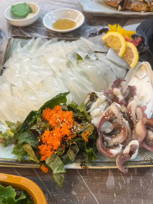 특히 기억에 남는 건, 이곳의 막회 한 접시였습니다. 회가 두툼하고 신선해서 비린 맛이라고는 찾아볼 수 없었고, 씹을수록 입안 가득 퍼지는 고소함이 일품이었어요. 날치알과 채소를 함께 비벼 먹으니 식감도 정말 재미있고요. 같이 나온 고등어구이도 겉바속촉으로 제대로 구워져서 막회와 환상의 궁합을 자랑했습니다. 한 상 가득 푸짐하게 차려진 상을 보니 정말 배가 터질 것 같았어요. 신선한 막회가 생각날 때면 무조건 이곳을 떠올릴 것 같습니다.